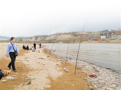 當(dāng)日下午3時許,蘭州晨報記者在雁白大橋西側(cè)的黃河岸邊看到12把魚竿一字排開,3名釣魚者坐在旁邊沙灘上正在等待魚兒上鉤,還有兩名中年男子正在周圍撒網(wǎng)。在相隔十多米處,記者發(fā)現(xiàn)還有兩名男子分別撐著魚竿釣魚,有一名捕魚者在撒網(wǎng)。“這是雙面粘漁網(wǎng),河內(nèi)稍大一些的魚兒只要撞進(jìn)網(wǎng)里就擺脫不了?!币幻遏~男子得意地說。