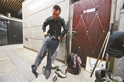 “他們說(shuō)我是假裝殘疾,我是二級(jí)視力殘疾,有正規(guī)的殘疾證。”李大鵬說(shuō),由于視神經(jīng)萎縮,眼前一片模糊,在地鐵車(chē)輛啟動(dòng)和停止之時(shí),自己很可能在慣性的作用下前傾摔倒,所以他選擇坐在地上,一手拿著放錢(qián)的紙箱,一手撐地,用屁股蹭著地面向前挪動(dòng)。他還強(qiáng)調(diào),自己手持的是盲人棍,而不是拐杖。