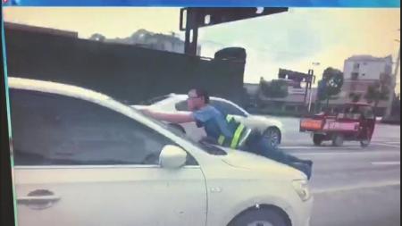 黑車司機(jī)將執(zhí)法人員頂上引擎蓋逃跑。視頻截圖