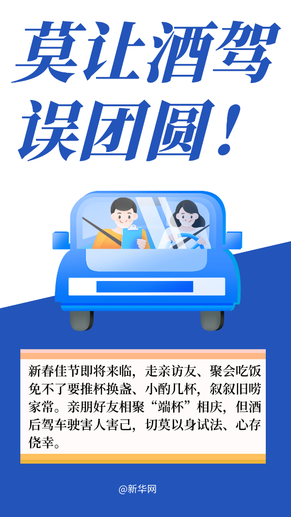 三、酒后駕駛要不得。春節(jié)期間走親訪友,免不了喝酒助興,觥籌交錯間一定要切記不能酒后駕駛機動車:根據(jù)國家監(jiān)督檢驗檢疫局發(fā)布的《車輛駕駛?cè)藛T血液、呼氣酒精含量閾值與檢驗》,血液中的酒精含量大于或者等于20mg/100ml就屬于飲酒駕車,大于或者等于80mg/100ml就屬于醉酒駕車。?