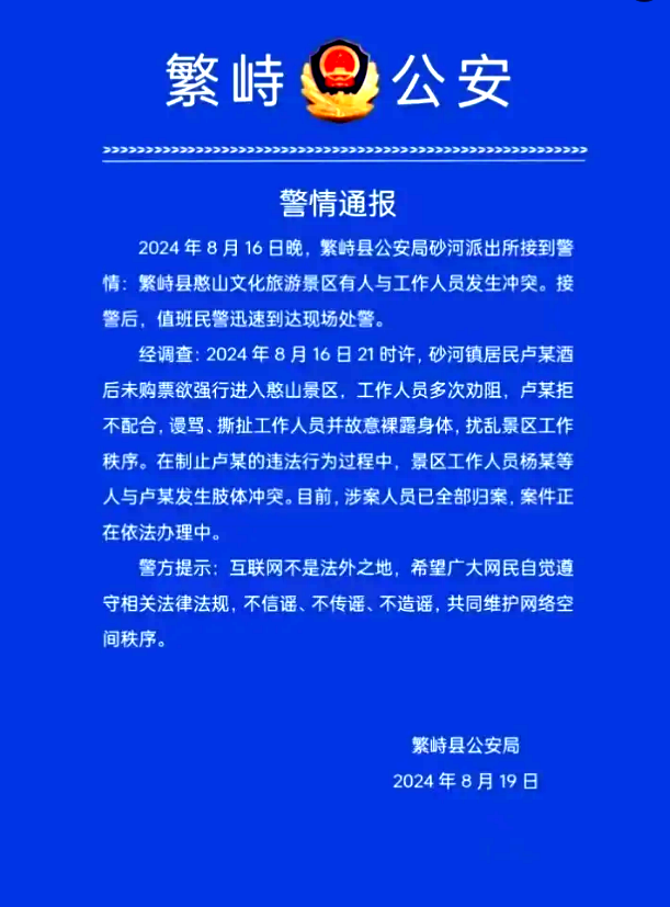 經(jīng)調(diào)查:2024年8月16日21時許,砂河鎮(zhèn)居民盧某酒后未購票欲強(qiáng)行進(jìn)入憨山景區(qū),工作人員多次勸阻,盧某拒不配合,謾罵、撕扯工作人員并故意裸露身體,擾亂景區(qū)工作秩序。在制止盧某的違法行為過程中,景區(qū)工作人員楊某等人與盧某發(fā)生肢體沖突。目前,涉案人員已全部歸案,案件正在依法辦理中。