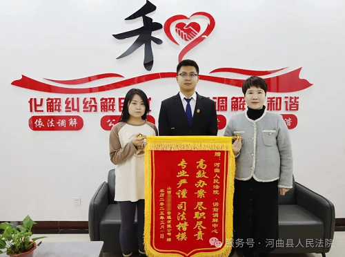 “感謝調(diào)解員為我們排憂解難,提供高效便捷的司法服務(wù),本來以為訴訟時間會很長,沒想到這么快就處理好了,今后我們一定努力提高服務(wù)水平。”近日,某物業(yè)公司將一面寫有“高效辦案盡職盡責(zé) 專業(yè)嚴謹司法楷模”的錦旗送至河曲法院訴前調(diào)解中心,對法院溫馨的訴訟服務(wù)和特邀調(diào)解員優(yōu)質(zhì)高效的調(diào)解表示感謝!