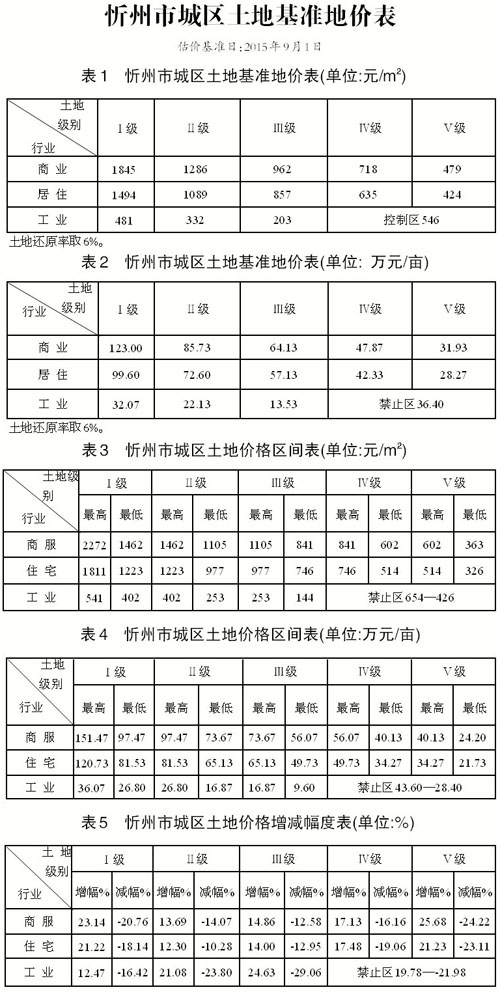 忻州市新一輪城鎮(zhèn)土地面積134.99平方公里基準(zhǔn)地價(jià)更新工作已經(jīng)省國(guó)土資源廳組織有關(guān)專家檢查驗(yàn)收。根據(jù)《山西省國(guó)土資源廳關(guān)于忻州市城鎮(zhèn)土地定級(jí)估價(jià)更新結(jié)果的批復(fù)》(晉國(guó)土資技審〔2015〕118號(hào)),現(xiàn)將忻州市城鎮(zhèn)土地基準(zhǔn)地價(jià)予以公布實(shí)施。