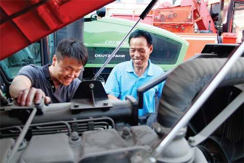 7 月13 日,兩位農(nóng)民在原平市農(nóng)機(jī)公司選購?fù)侠瓩C(jī)。近年來,原平市落實(shí)各項(xiàng)惠農(nóng)政策,極大地調(diào)動了農(nóng)民購買和使用農(nóng)機(jī)具的積極性,在小麥?zhǔn)崭罱咏猜曋H,農(nóng)民抓緊時間選購?fù)侠瓩C(jī)等國家補(bǔ)貼農(nóng)機(jī)具,為在麥田地里進(jìn)行夏播做準(zhǔn)備。(褚震 攝)