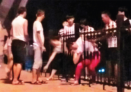 8月9日晚21點(diǎn)左右,在城區(qū)云中河景區(qū)游園乘涼的市民依然絡(luò)繹不絕。一群十五六歲學(xué)生模樣的青年將幕山橋上的鐵柵欄分開,一個(gè)個(gè)鉆過(guò)隔離欄魚貫而出,引來(lái)橋上欣賞夜景的市民們一片譴責(zé)之聲。