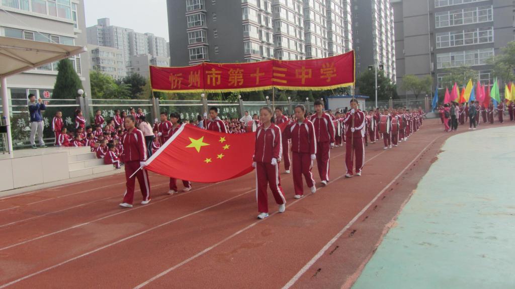 沐浴著秋天的朝陽,享受著清爽的秋風(fēng)。9月28日上午,忻州市第十三中學(xué)第十一屆秋季運(yùn)動會開幕式在學(xué)校操場隆重舉行。伴隨著激昂的運(yùn)動員進(jìn)行曲,國旗隊(duì)、鼓樂隊(duì)、彩旗隊(duì)、裁判員代表和運(yùn)動員方隊(duì)秩序井然而又氣勢磅礴地走入會場。在莊嚴(yán)的國歌聲中,全體師生凝神肅立,齊唱國歌。鮮艷的五星紅旗在操場上冉冉升起。