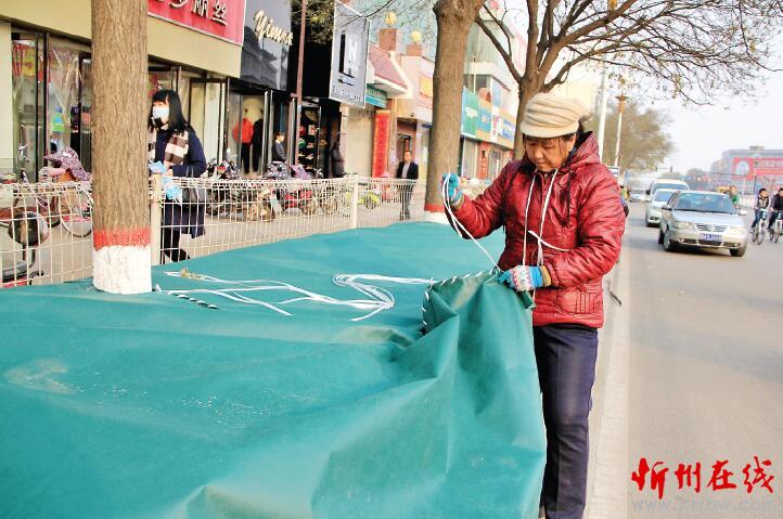11月20日,原平市前進(jìn)大街的一群工作人員正在飛針走線,為街道兩旁的綠化帶縫棉被,助它們溫暖過冬。原平市加大城市綠化的同時,采取多種措施保護(hù)綠色,分配包干,責(zé)任到人,責(zé)成專人進(jìn)行修剪、澆水,對越冬的綠化帶全部覆蓋防寒專用布,既美化了越冬綠化帶,又保護(hù)綠化帶不被損傷。(吉建平 攝)