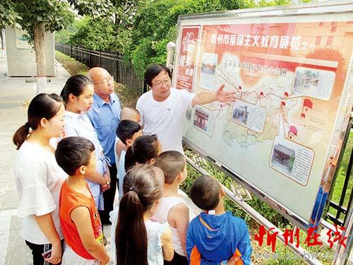 檔案人董建平(中)向青少年義務(wù)宣講愛(ài)國(guó)主義教育展覽。