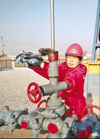 馮萌萌正在調(diào)整油井盤根