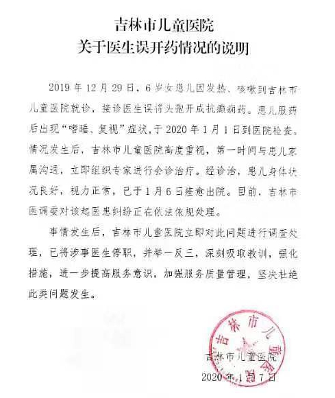 人民網(wǎng)北京1月8日電 1月7日,吉林市兒童醫(yī)院在其網(wǎng)站發(fā)布關于醫(yī)生誤開藥情況的說明稱,2019年12月29日,一名6歲女患兒因發(fā)熱、咳嗽到吉林市兒童醫(yī)院就診,接診醫(yī)生誤將頭孢開成抗癲癇藥造成患兒出現(xiàn)“嗜睡、復視”的癥狀。經(jīng)專家會診治療,患兒身體狀況良好,視力正常,已于1月6日痊愈出院。