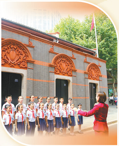 中共一大會址,上海市的小學生在老師指揮下齊唱《沒有共產(chǎn)黨就沒有新中國》。陳亞東攝