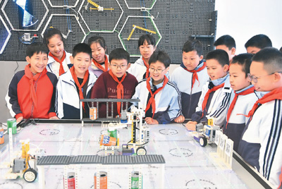 圖為江蘇省無(wú)錫市太湖格致中學(xué)以校園定點(diǎn)引導(dǎo)型機(jī)器人為主題,開展人工智能課堂教學(xué)。顧曉驊攝