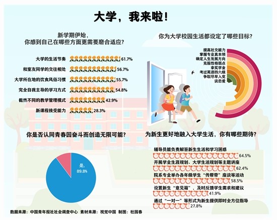 開學(xué)季,大一新生陸續(xù)報(bào)到,開啟了全新的校園生活。人際交往、學(xué)習(xí)氛圍、生活方式……各方面都需要去探索和適應(yīng)。面對(duì)嶄新的人生階段,他們準(zhǔn)備好了嗎?他們?yōu)樽约旱拇髮W(xué)設(shè)立了什么目標(biāo)?