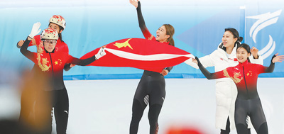 第九屆亞冬會短道速滑女子3000米接力A組決賽,中國隊奪得冠軍。新華社記者 楊 磊攝