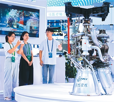 展區(qū)內(nèi),工作人員介紹焦點一號15噸液氮甲烷發(fā)動機。陳冬冬攝