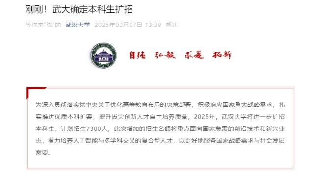 3月7日,據(jù)武漢大學(xué)微信公眾號消息,為深入貫徹落實(shí)黨中央關(guān)于優(yōu)化高等教育布局的決策部署,積極響應(yīng)國家重大戰(zhàn)略需求,扎實(shí)推進(jìn)優(yōu)質(zhì)本科擴(kuò)容,提升拔尖創(chuàng)新人才自主培養(yǎng)質(zhì)量,2025年,武漢大學(xué)將進(jìn)一步擴(kuò)招本科生,計(jì)劃招生7300人。此次增加的招生名額將重點(diǎn)面向國家急需的前沿技術(shù)和新興業(yè)態(tài),著力培養(yǎng)人工智能與多學(xué)科交叉的復(fù)合型人才,以更好地服務(wù)國家戰(zhàn)略需求與社會(huì)發(fā)展需要。