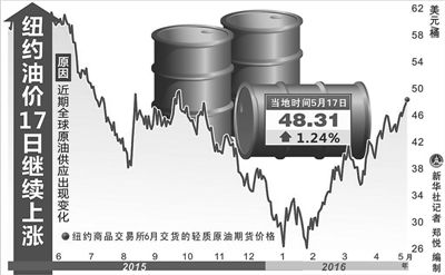近期,國際原油價格屢現(xiàn)攀升,逼近每桶50美元。5月17日,截至當(dāng)日收盤,紐約商品交易所6月交貨的輕質(zhì)原油期貨價格上漲0.59美元,收于每桶48.31美元,漲幅為1.24%。7月交貨的倫敦布倫特原油期貨價格上漲0.31美元,收于每桶49.28美元,漲幅為0.63%。分析認(rèn)為,一些突發(fā)因素導(dǎo)致了近期油價攀升,國際油市實(shí)現(xiàn)供需平衡仍需時日。