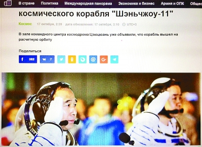 十月十七日,俄羅斯塔斯社網(wǎng)站第一時(shí)間發(fā)布的題為《中國(guó)成功發(fā)射神舟十一號(hào)載人飛船》的報(bào)道。本報(bào)駐莫斯科記者 汪嘉波攝/光明圖片