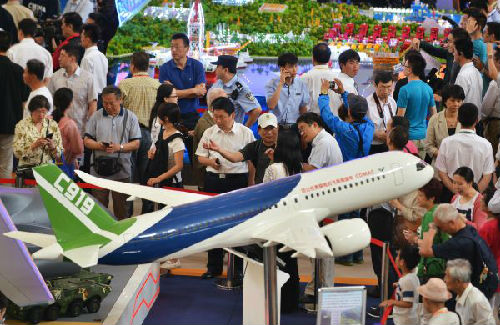 2016年6月7日,觀眾在國家“十二五”科技創(chuàng)新成就展上參觀國產(chǎn)C919飛機模型。(新華社)