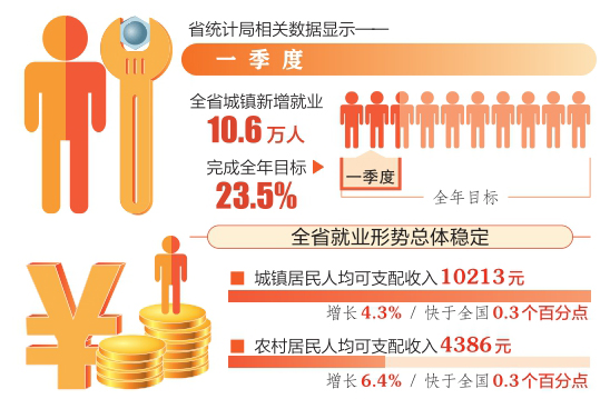 經(jīng)濟穩(wěn),就業(yè)穩(wěn),收入增。省統(tǒng)計局相關(guān)數(shù)據(jù)顯示,一季度,全省城鎮(zhèn)居民人均可支配收入10213元,增長4.3%,快于全國0.3個百分點。農(nóng)村居民人均可支配收入4386元,增長6.4%,快于全國0.3個百分點。
