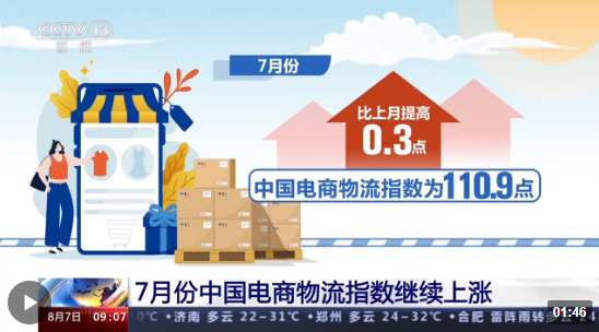 中國(guó)物流與采購聯(lián)合會(huì)今天(7日)公布了7月份中國(guó)電商物流指數(shù)。受益于供給端各項(xiàng)指數(shù)的穩(wěn)步上漲,中國(guó)電商物流指數(shù)較上月有所提高,繼續(xù)保持連續(xù)上漲態(tài)勢(shì)。