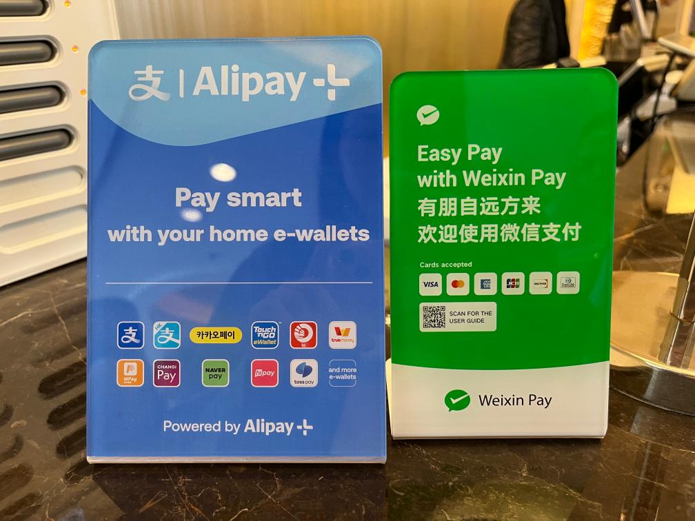 北京香格里拉飯店內擺放的支付寶、微信支持使用境外電子錢包和境外銀行卡標識。新華社記者張千千 攝