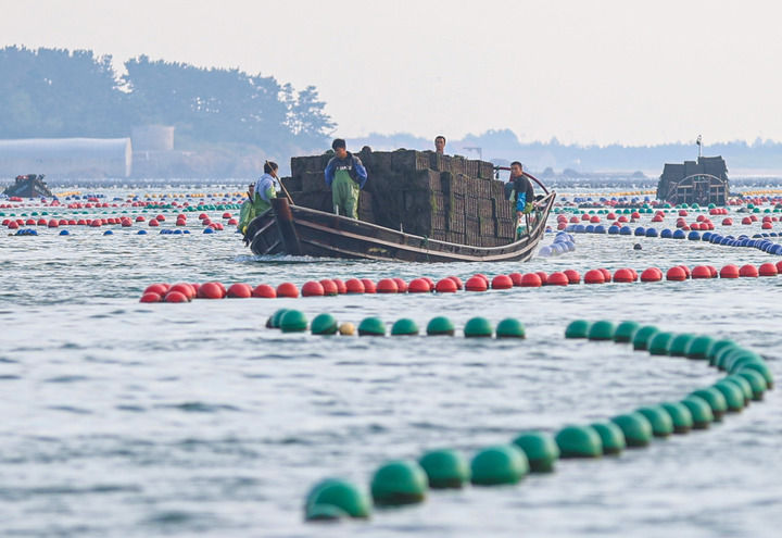 在山東省榮成市愛倫灣海域,鮑魚養(yǎng)殖戶駕駛滿載鮑魚的漁船返回(2024年9月11日攝)。新華社發(fā)(李信君攝)