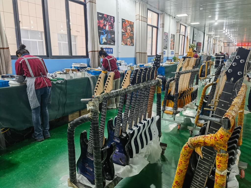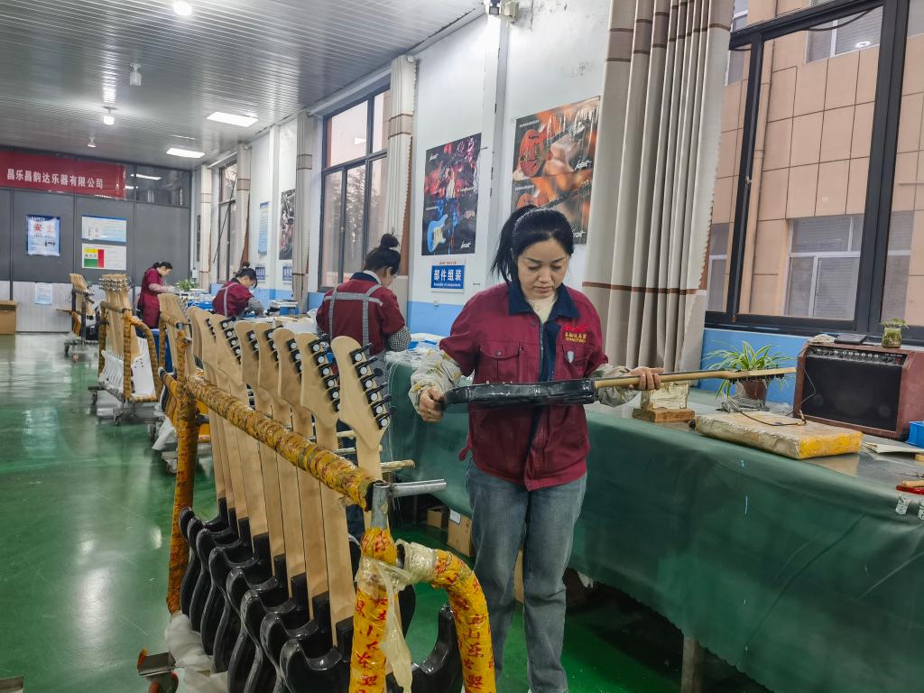 濰坊大唐樂(lè)器發(fā)展有限公司生產(chǎn)的個(gè)性化定制電吉他受到海外市場(chǎng)歡迎。新華社記者 王志 攝