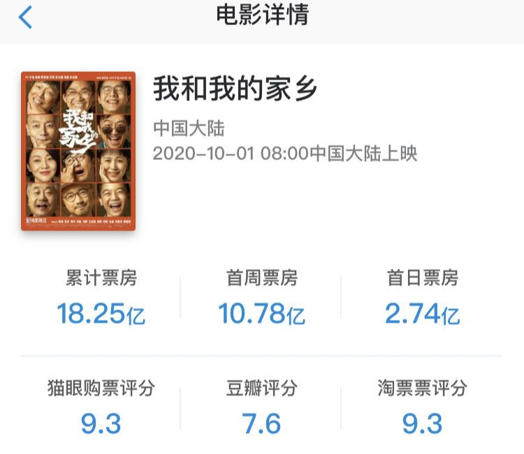 值得注意的是,國慶檔期間,《我和我的家鄉(xiāng)》連續(xù)8日實現(xiàn)單日票房過億。此外,該片在貓眼和淘票票評分均為9.3,實現(xiàn)了票房口碑雙豐收。
