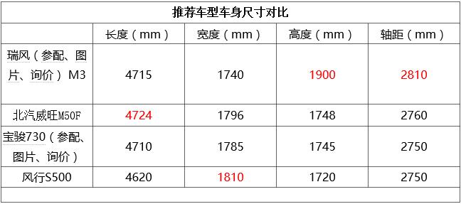 推薦車型車身尺寸對比