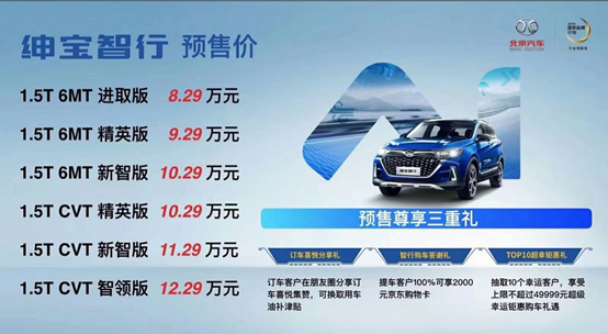 據(jù)悉,從8月31日成都車展開始,北京汽車已經(jīng)啟動(dòng)了紳寶智行預(yù)售活動(dòng),并推出訂車喜悅分享禮、智行購車答謝禮、TOP10超幸鉅惠禮三重大禮,最高能省49999元。