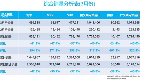 轎車3月售出499538輛,同比下滑41.8%,環(huán)比增長(zhǎng)294.9%;1季度轎車共售出1444967輛,同比下滑42.3%。MPV則“借”疫情之勢(shì)繼續(xù)墜落,3月共售出68617輛,同比下滑47.4%;1季度,共售出184832輛,下滑幅度超過(guò)50%。