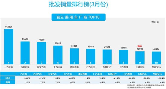 自主品牌走勢(shì)總體偏弱,市場(chǎng)份額下降。但值得注意的是,自主品牌分化表現(xiàn)愈發(fā)明顯。受疫情后剛需崛起對(duì)高性價(jià)比車型需求的提升、自主企業(yè)充足的庫(kù)存優(yōu)勢(shì)、以及近期自主品牌突破式的創(chuàng)新疊加推動(dòng),自主領(lǐng)頭企業(yè)表現(xiàn)再進(jìn)一步。3月,狹義乘用車廠商銷量排名中,吉利勇奪季軍、長(zhǎng)安位居第5名,“內(nèi)、外齊開(kāi)花”的長(zhǎng)城同樣進(jìn)入前十;相比之下,中小企業(yè)則將面臨更艱難的生存困境。