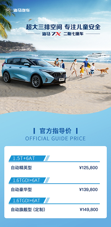 8月23日,海馬汽車旗下全新MPV海馬7X正式上市,共推出搭載1.5T/1.6TGDI兩款動力的三款車型,售價區(qū)間12.58-14.98萬元。