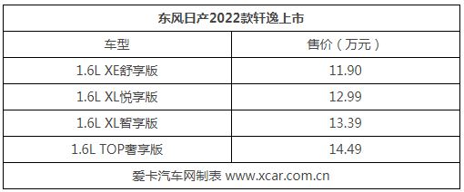 9月15日,東風(fēng)日產(chǎn)2022款軒逸正式上市,售價(jià)區(qū)間為11.9-14.49萬(wàn)元。2022款軒逸在外觀方面延續(xù)了現(xiàn)款車(chē)型的設(shè)計(jì),主要針對(duì)配置進(jìn)行提升,新增了EPKB電子手剎+Autohold自動(dòng)駐車(chē)、LDP車(chē)道偏離糾正系統(tǒng)等功能。詳細(xì)售價(jià)請(qǐng)見(jiàn)下表:
