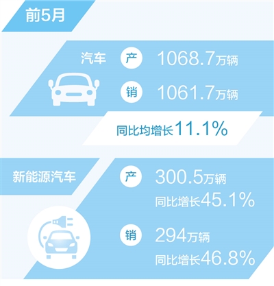 新能源汽車(chē)持續(xù)快速增長(zhǎng)。1—5月,新能源汽車(chē)產(chǎn)銷(xiāo)分別完成300.5萬(wàn)輛和294萬(wàn)輛,同比分別增長(zhǎng)45.1%和46.8%,市場(chǎng)占有率達(dá)到27.7%。中國(guó)汽車(chē)工業(yè)協(xié)會(huì)有關(guān)負(fù)責(zé)人表示,新能源汽車(chē)車(chē)輛購(gòu)置稅減免政策的延續(xù)和優(yōu)化,將進(jìn)一步穩(wěn)定市場(chǎng)預(yù)期,利好需求釋放。(王政)