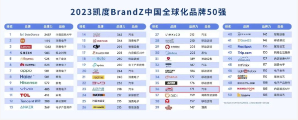 江淮汽車榮登BrandZ全球化品牌50強第36位