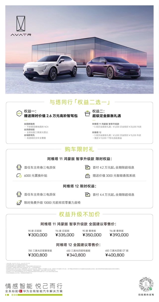 權(quán)益一,1月8日后購車的用戶贈送限時價值26,000元高階智駕包,以不依賴高精地圖的NCA帶來全域都領(lǐng)先的高速城區(qū)泊車全覆蓋體驗。權(quán)益二,活動期間購車用戶可享5倍定金膨脹禮遇,5000定金抵扣25,000元車款,車價立減兩萬元。與此同時,阿維塔推出更多貼心限時權(quán)益:首任車主終身三電質(zhì)保,6000元置換補貼即刻擁有;另外,全系車主可享智能香氛系統(tǒng)贈送,并擁有首付4.2萬元起、全期限超低息的購車金融權(quán)益。與此同時,阿維塔 11 鴻蒙版智享升級款全國零售價30萬- 39萬元,真正做到產(chǎn)品升級不加價。