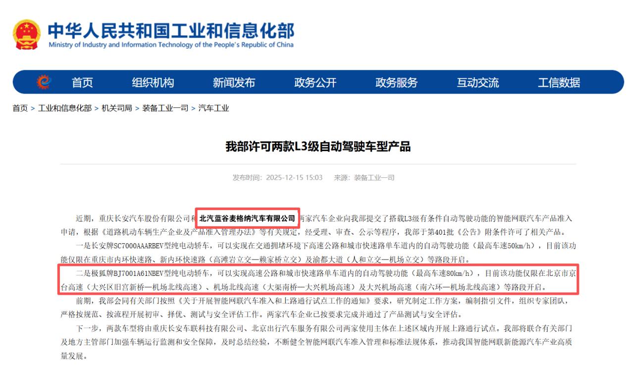 12月15日,北汽集團(tuán)旗下極狐阿爾法S(L3版)正式獲批工業(yè)和信息化部自動(dòng)駕駛車型產(chǎn)品準(zhǔn)入許可,即將在北京市限定區(qū)域內(nèi)開展L3級(jí)有條件自動(dòng)駕駛上路通行試點(diǎn)。這標(biāo)志著我國自動(dòng)駕駛技術(shù)發(fā)展逐步走向量產(chǎn)應(yīng)用階段,也是北汽集團(tuán)在自動(dòng)駕駛領(lǐng)域從技術(shù)驗(yàn)證階段邁向量產(chǎn)應(yīng)用階段的重要里程碑。