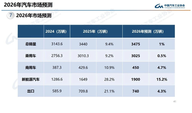 與此同時,中汽協(xié)對2026年汽車市場進行了預測。2026年,預計國產汽車總銷量將達到3475萬輛,微增1%。其中,乘用車預計為3025萬輛,微增0.5%;商用車預計為450萬輛,小幅增長4.7%;新能源汽車預計為1900萬輛,增長15.2%;汽車出口量預計為740萬輛,小幅增長4.3%。