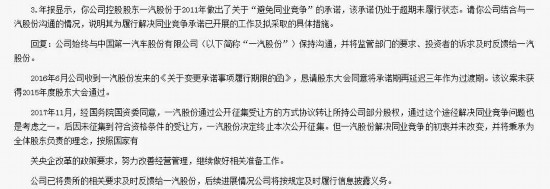 2011年6月,一汽股份成立之初,曾向一汽轎車和一汽夏利作出不可撤銷承諾:在一汽股份成立后五年內(nèi)通過資產(chǎn)重組或其他方式整合所屬的轎車整車生產(chǎn)業(yè)務(wù),以解決同業(yè)競(jìng)爭(zhēng)問題。但五年過去了,這一問題并未得到解決,在2016年6月28日,一汽轎車和一汽夏利同時(shí)發(fā)布公告稱,一汽股份原計(jì)劃在五年內(nèi)解決其與子公司一汽轎車、一汽夏利同業(yè)競(jìng)爭(zhēng)的承諾無法履行,將承諾期再度延遲三年作為過渡期,而上述承諾的截止日期,也就是2019年6月28日。