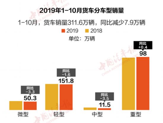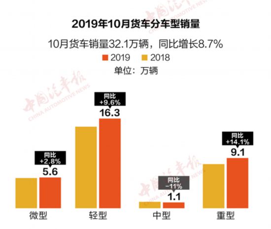 10月整體汽車銷量繼續(xù)下滑,同比下降4%,在車市寒冬中,商用車回暖態(tài)勢(shì)明顯,在各地加快更新淘汰及投資拉動(dòng)等因素的影響下,本月商用車?yán)^續(xù)保持較好的增長(zhǎng)勢(shì)頭,漲幅與9月相比有擴(kuò)大的趨勢(shì)。