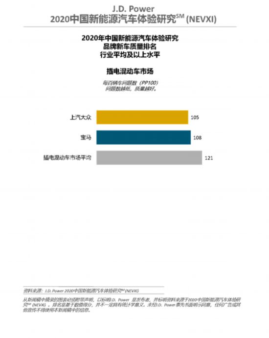 研究結(jié)果顯示,上汽大眾(105 個(gè) PP100)獲得插電混動(dòng)車市場(chǎng)新車質(zhì)量第一名,寶馬(108個(gè)PP100)位列插電混動(dòng)車市場(chǎng)第二位。蔚來(109 個(gè) PP100)獲得純電動(dòng)車市場(chǎng)新車質(zhì)量第一名,特斯拉(113個(gè)PP100)和歐拉(129個(gè)PP100)位列純電動(dòng)車市場(chǎng)第二和第三位;車型層面,歐拉R1榮獲小型純電動(dòng)細(xì)分市場(chǎng)第一;榮威Ei5榮獲緊湊型純電動(dòng)細(xì)分市場(chǎng)第一;蔚來ES6摘得中型純電動(dòng)細(xì)分市場(chǎng)第一;大眾帕薩特 PHEV 摘得主流插電混動(dòng)細(xì)分市場(chǎng)第一;豪華插電混動(dòng)和大型純電動(dòng)細(xì)分市場(chǎng)因?yàn)椴粷M足細(xì)分市場(chǎng)頒獎(jiǎng)條件,因而沒有獎(jiǎng)項(xiàng)頒出。