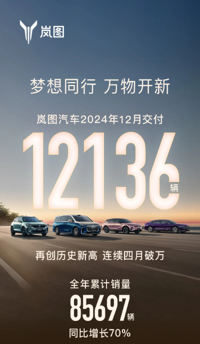 2024年1-12月,嵐圖汽車?yán)塾?jì)交付85697輛,同比增長70%,迸發(fā)出強(qiáng)勁的增長勢能。不僅如此,銷量實(shí)現(xiàn)“八連漲”,連續(xù)四個(gè)月躋身“萬輛俱樂部”,且產(chǎn)品市場均價(jià)穩(wěn)定在35萬元以上,使得嵐圖成為汽車企業(yè)高質(zhì)量發(fā)展的典型代表。作為用戶型科技企業(yè),嵐圖汽車將高質(zhì)量發(fā)展落實(shí)到每一處細(xì)節(jié),深度契合新產(chǎn)業(yè)、新業(yè)態(tài)、新模式要求,走出了一條獨(dú)具特色且極具示范意義的道路。