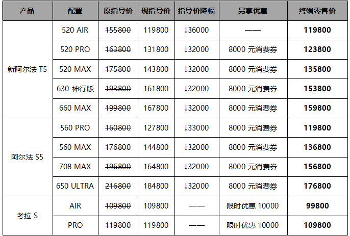 即日起,極狐對新阿爾法T5和阿爾法S5官方指導(dǎo)價進行下調(diào),官方降價32000元,還可另享8000元消費券,如此一來,5系“雙子星”終端零售價最低僅需11.98萬元;考拉S限時優(yōu)惠增至10000元,終端零售價直接下探到了9.98萬元起。