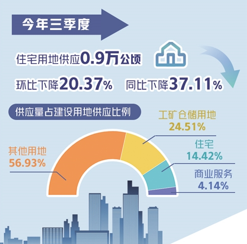 該報告顯示,三季度全國105個主要監(jiān)測城市建設用地供應面積6.24萬公頃,環(huán)比增加7.34%,同比下降17.28%。除住宅用地外,商業(yè)服務用地供應0.26萬公頃,環(huán)比下降18.34%,同比下降39.18%;工礦倉儲用地供應1.53萬公頃,環(huán)比增加4.57%,同比下降21.53%;交通、水利基礎設施等其他用地供應3.55萬公頃,環(huán)比增加22.31%,同比下降4.98%。