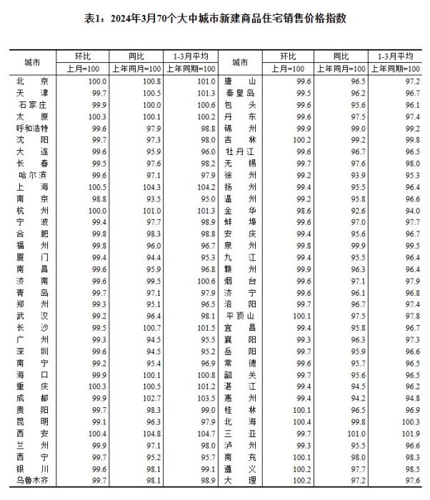 2024年3月70個(gè)大中城市新建商品住宅銷售價(jià)格指數(shù)。 截圖自國(guó)家統(tǒng)計(jì)局官網(wǎng)