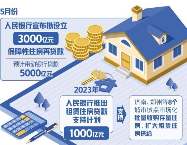 5月,人民銀行宣布擬設立3000億元保障性住房再貸款,按照“政府主導、市場化運作”的思路,由中國人民銀行提供低成本再貸款資金,激勵21家全國性銀行機構(gòu)按照市場化、法治化原則,支持地方國有企業(yè)以合理價格收購已建成存量商品房,用作配售型或配租型保障性住房,預計帶動銀行貸款5000億元。