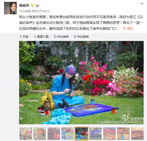 13日,舞蹈家楊麗萍在微博曬出一組自己在花園中作畫的照片。只見楊麗萍民族風(fēng)裝扮,而她所在的周圍鮮花滿布,姹紫嫣紅,還不時(shí)地有幾只鳥落在身旁,好似人間仙境。