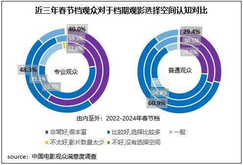 2024年春節(jié)檔優(yōu)質(zhì)的影片內(nèi)容矩陣有效拉動觀影及討論氛圍,檔期內(nèi)有合計(jì)90.3%的普通觀眾認(rèn)為檔期觀影選擇空間“非常好”或“比較好”,這一占比較去年同期高出2.9個(gè)百分點(diǎn);專業(yè)觀眾這一占比為88.3%,略低于去年同期。